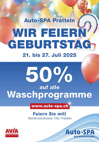 Geburtstagsaktion im Auto-SPA Pratteln 50% auf alle Waschprogramme!Wir feiern Geburtstag – feiern Sie mit! Vom 21. bis 27. Juli 2025 erhalten Sie 50% auf alle Waschprogramme im Auto-SPA Pratteln. Waschprogramme Patrick2025-07-16T08:47:07+02:0016.07.2025|AKTIONEN| Teilen Sie diesen Artikel! FacebookLinkedInWhatsAppE-Mail